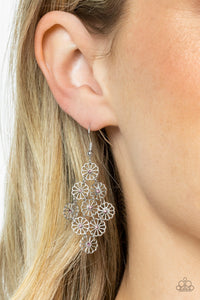 Dotted with dainty purple rhinestone centers, an airy collection of stenciled silver flowers link into a whimsical floral lure. Earring attaches to a standard fishhook fitting.