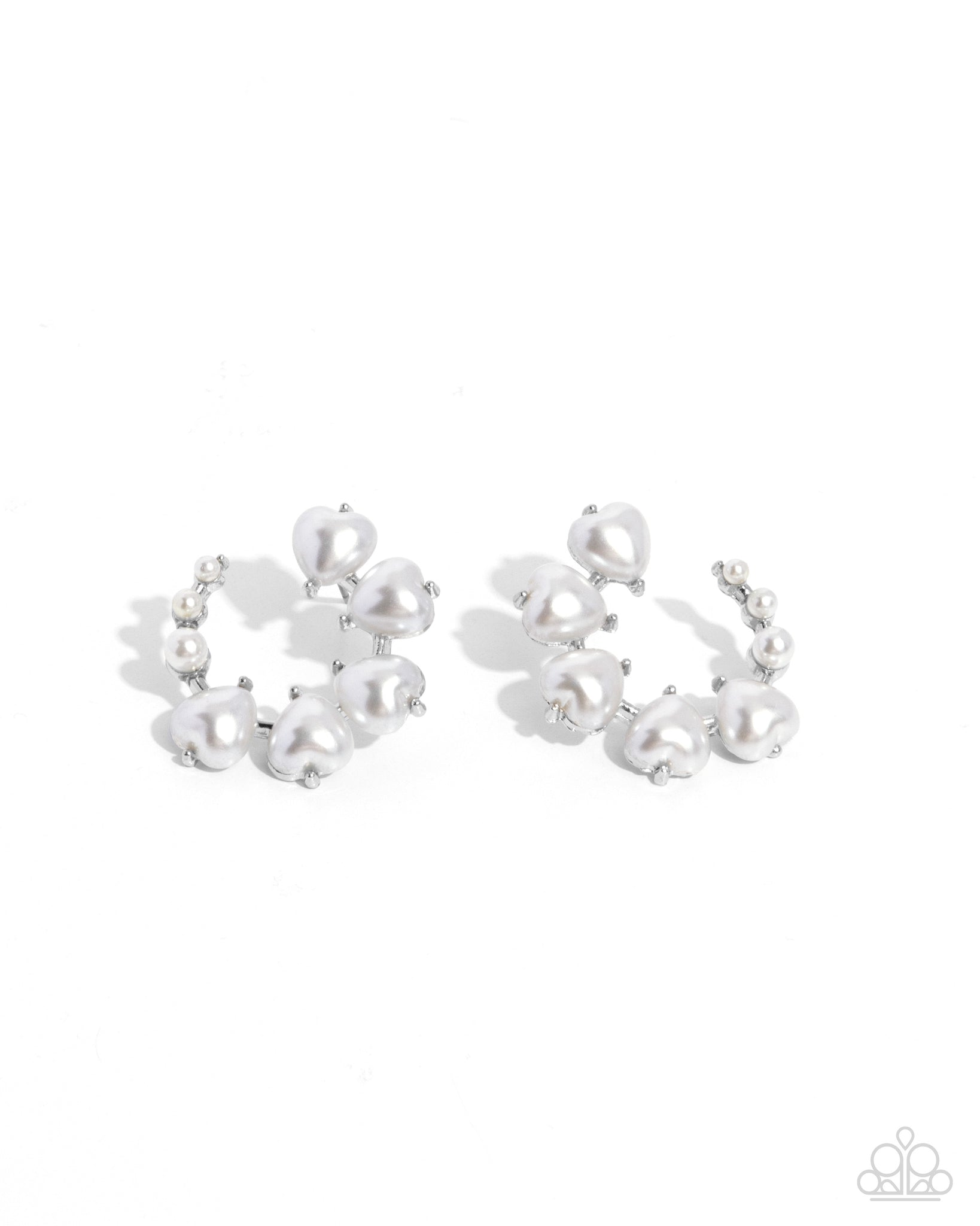 Gradually increasing in dimension, a collection of glossy white pearls elongates into glossy pearly hearts, pronged in place along a thin silver hoop for a radically romantic look. Earring attaches to a standard post fitting.