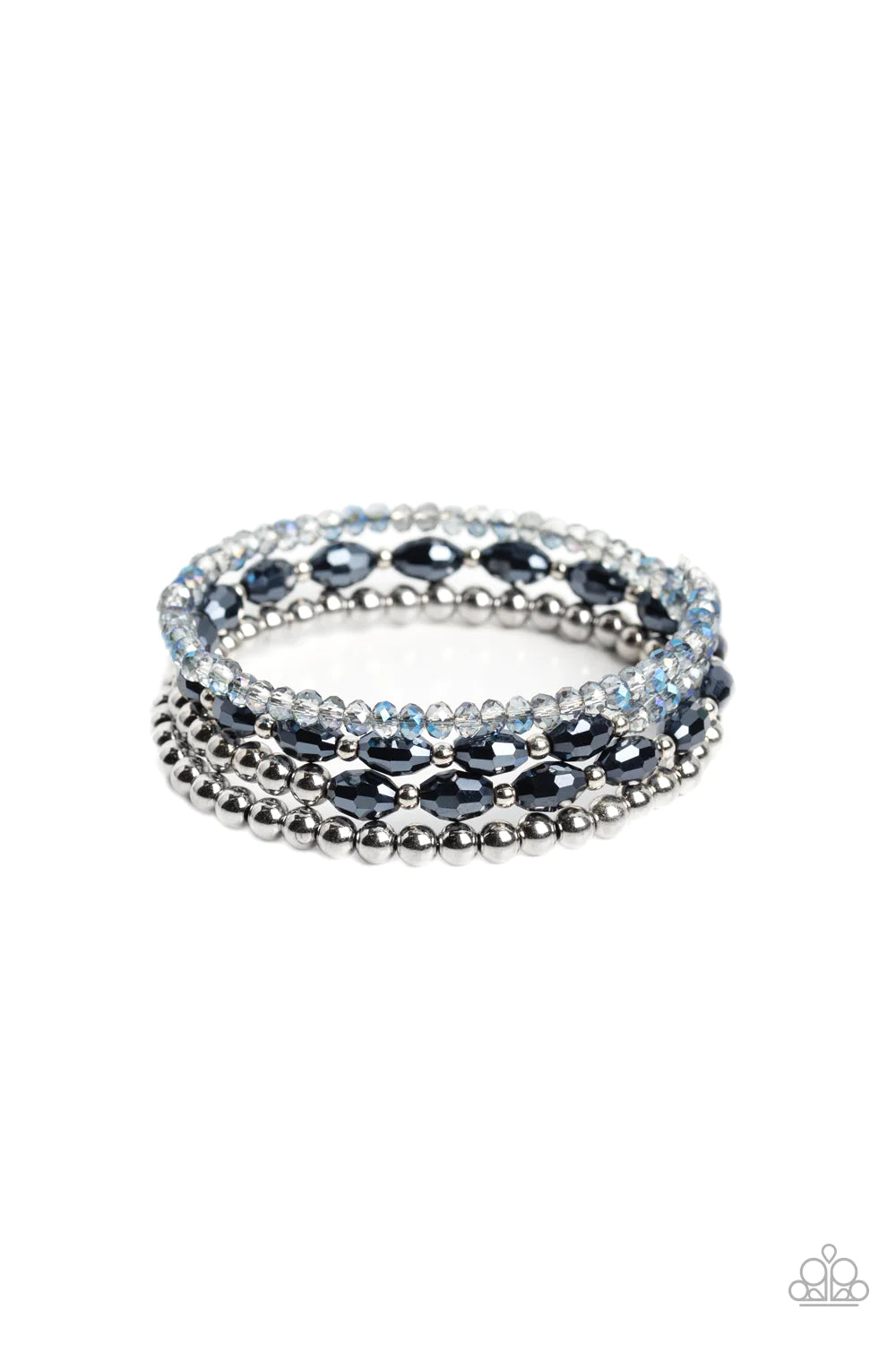 A celestial collection of silver beads, silver studs, opaque, blue rhombus beads, and opaque glassy blue beads are threaded along a coiled wire, creating a blinding infinity wrap style bracelet around the wrist.
