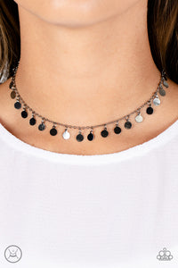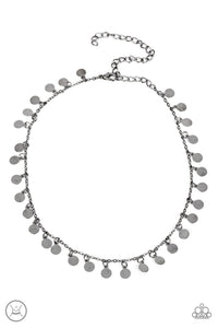 Tiny gunmetal discs dance along a classic gunmetal chain, creating an understated choker necklace. The reflective surfaces of the discs shimmer brightly, as the light catches their high sheen finish to exaggerate their intensity. Features an adjustable clasp closure.