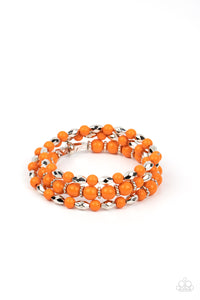 A mismatched collection of faceted silver beads, studded silver rings, and refreshing orange beads are threaded along a wire that coils around the wrist, creating a colorful infinity wrap style bracelet.