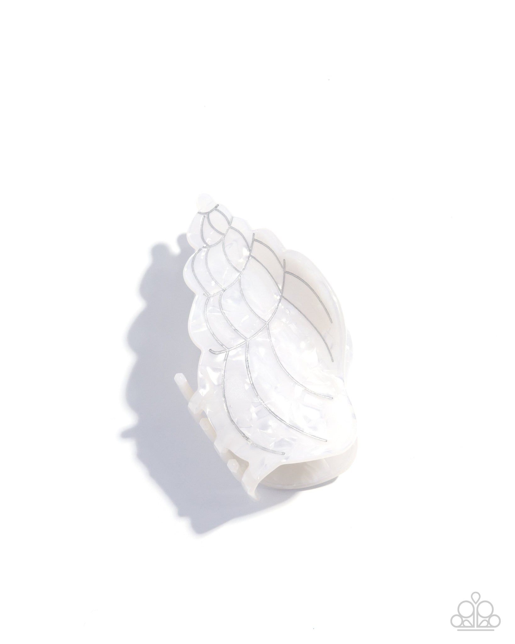 Featuring silver veining, a white shimmery conch claw clip holds the hair away from the face for an on-the-go coastal display. Clip measures approximately 2 3/4" in length and 1 3/4" in width.
