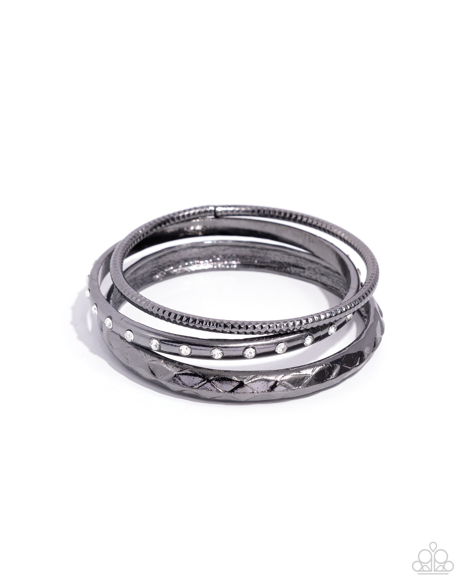 A thick gunmetal bangle that is embossed and faceted in an edgy geometric pattern joins a mismatched pair of white rhinestone encrusted and diamond cut gunmetal bangles that glide across the wrist for a gritty pop of shimmer.
