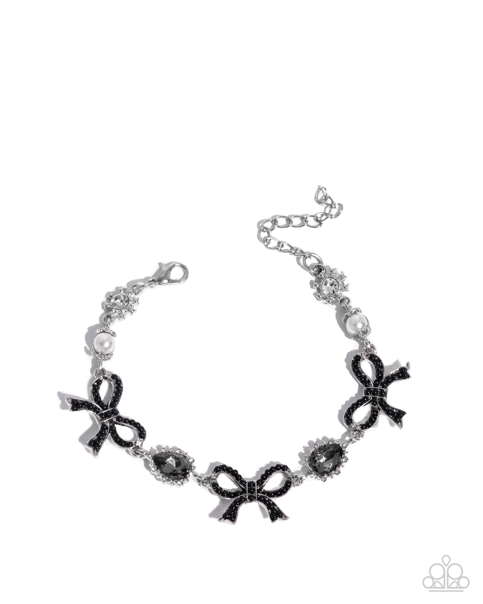 Dainty black beads line the frames of a trio of silver bow charms, alternating along the wrist with smoky teardrops bordered with dainty white rhinestones. Two polished pearls with capped silver beads join white rhinestones nestled inside studded silver frames on each end, adding a playful twist to the whimsical design. Features an adjustable clasp closure.