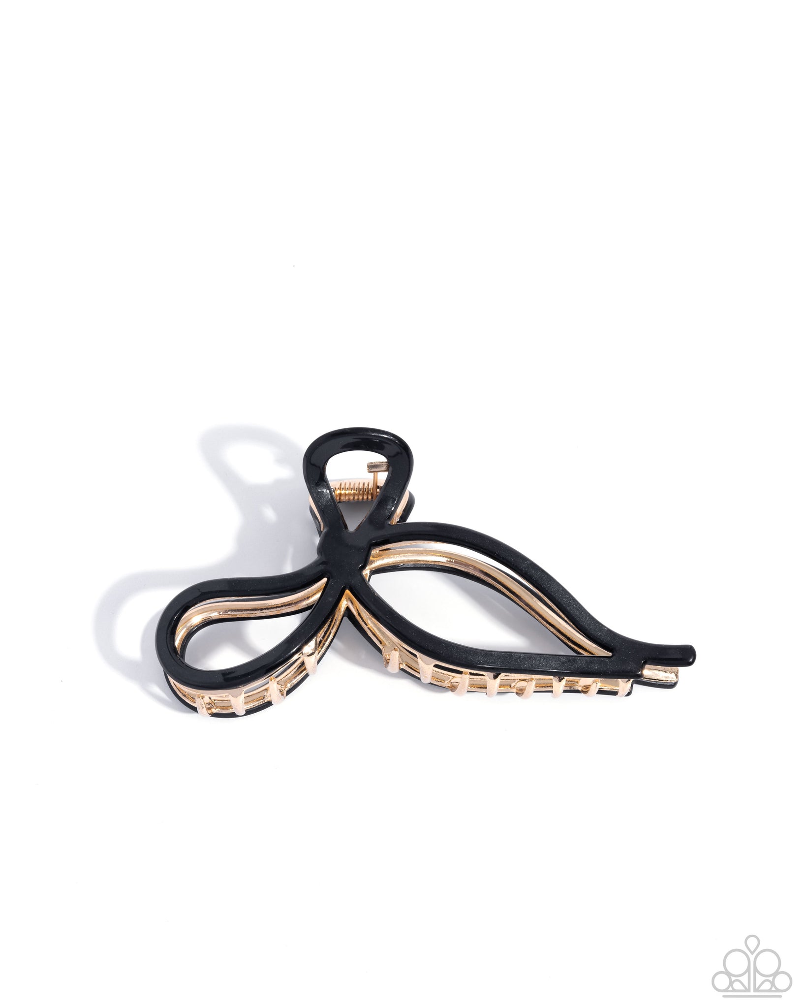 Featuring a high-sheen black finish, this refined gold bow claw clip holds the hair away from the face for an on-the-go chic display. Clip measures approximately 4 1/2" in length and 2 1/2" in width.