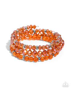 Threaded along a coiled wire, a collection of orange beads in various opacities alternate with silver beads creating a classy, cultured infinity wrap-style bracelet around the wrist.