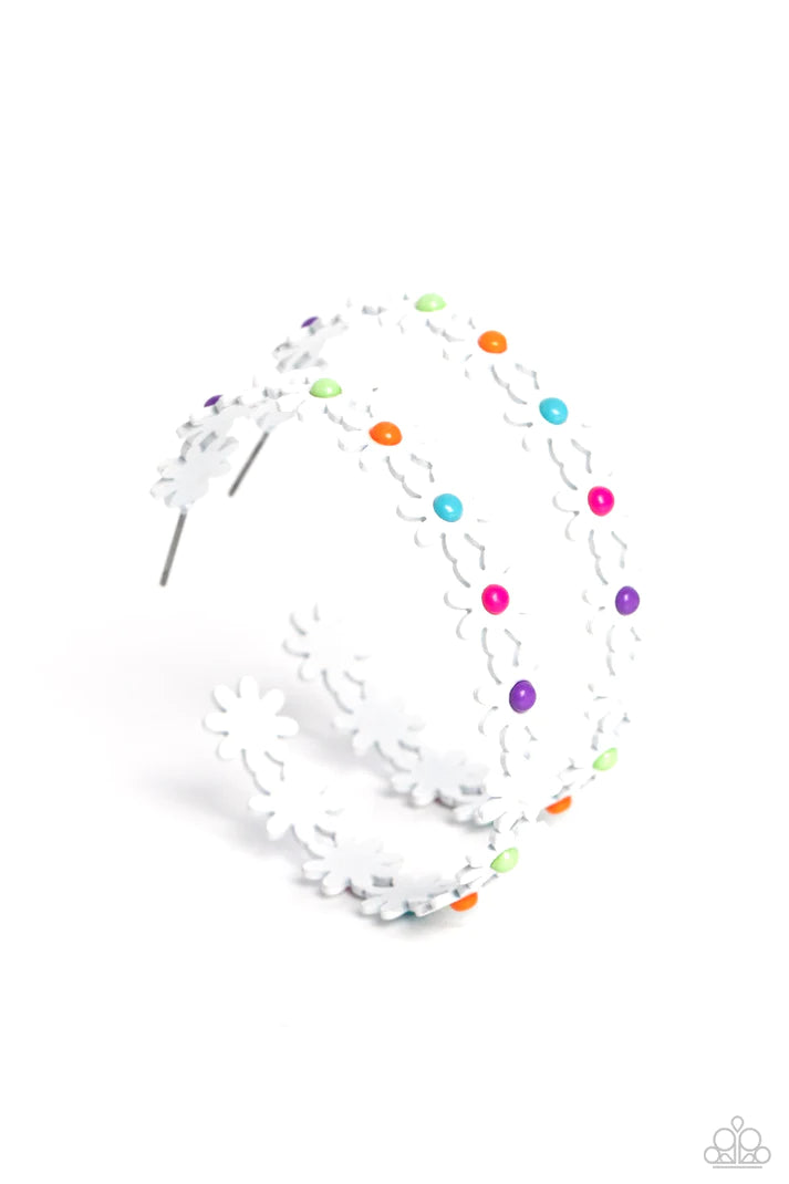 A dainty collection of white daisies with white, orange, green, blue, pink, and purple centers blooms into a free-spirited hoop around the ear. Earring attaches to a standard post fitting. Hoop measures approximately 2" in diameter.