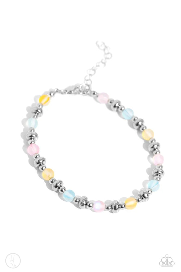 Infused with dainty silver accents, a collection of blue, yellow, and pink reflective beads are threaded along an invisible band around the ankle for a seasonal finish.