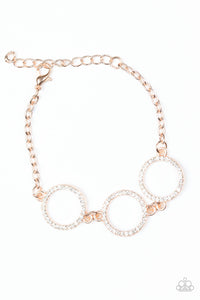 Encrusted in glassy white rhinestones, three glittery rose gold rings link across the wrist for a glamorous look. Features an adjustable clasp closure.