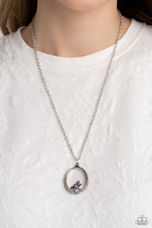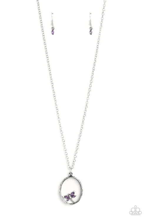 Falling from a high-sheen silver chain, a thick oval pendant with a faceted clear center lengthens the torso as it swings from the bottom of the chain. Swinging from the center of the shimmery pendant, an intricate dragonfly charm, lined with dainty purple and white rhinestones creates additional eye-catching movement. Silver filigree and a dot motif border around the oval design creating whimsical cutouts for an elegantly earthy finish. Features an adjustable clasp closure.