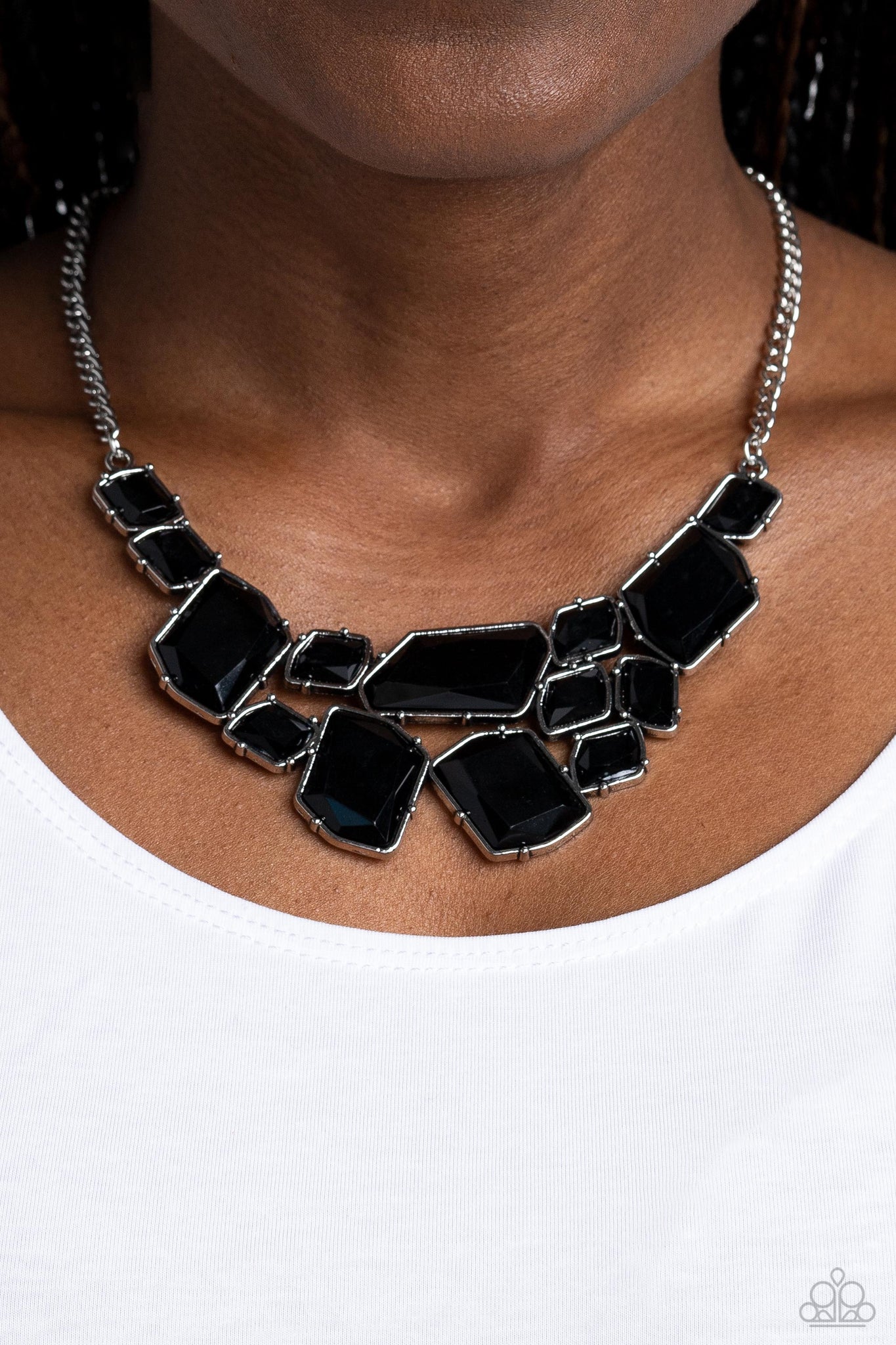 Featuring emerald-style cuts, faceted black beads are pressed into sleek, pronged silver frames. The colorful frames join at the bottom of a shimmery silver chain, creating a bold geometric fringe below the collar. Features an adjustable clasp closure.