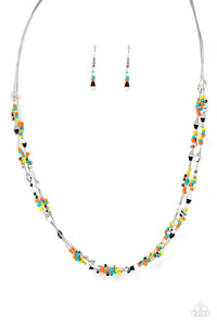 A dainty collection of faceted silver beads, multi-colored seed beads, and silver cubes are threaded along multiple strands of silver wire below the collar, creating clustered layers. Features an adjustable clasp closure.