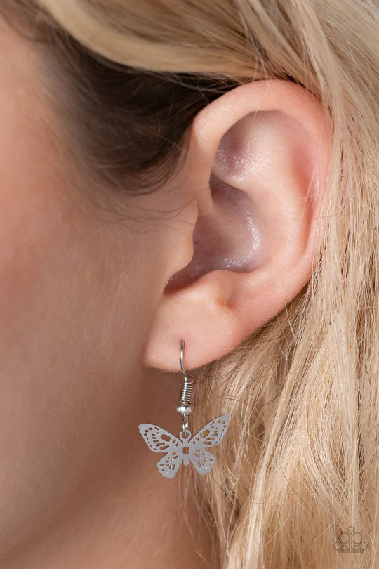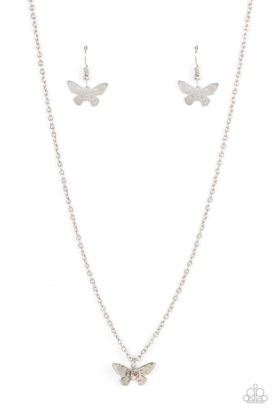 Layered with ornate silver wings, an iridescent pink rhinestone dotted butterfly flutters from a dainty silver chain below the collar for a whimsical fashion. Features an adjustable clasp closure.