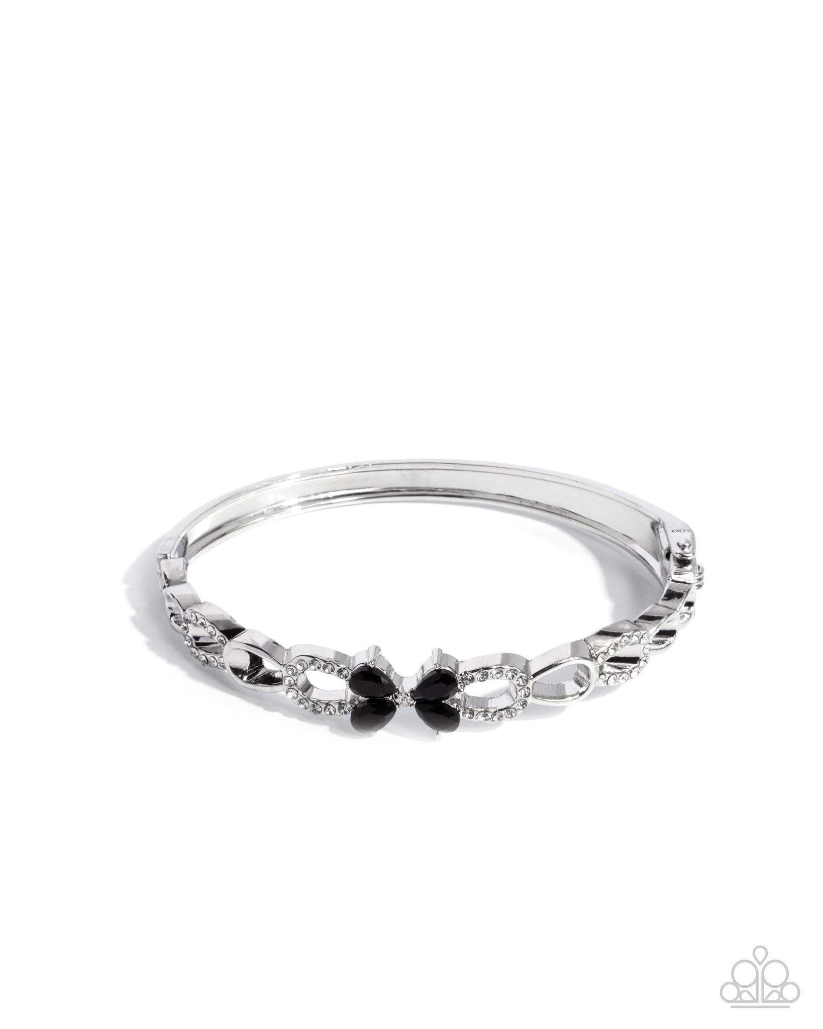 Dusted in white rhinestones, interconnected silver hoops coalesce across the front of the wrist, alternating with sleek silver hoops for a refined display. A faceted black teardrop-winged butterfly flutters atop the center for a whimsical finish. Features a hinged closure.