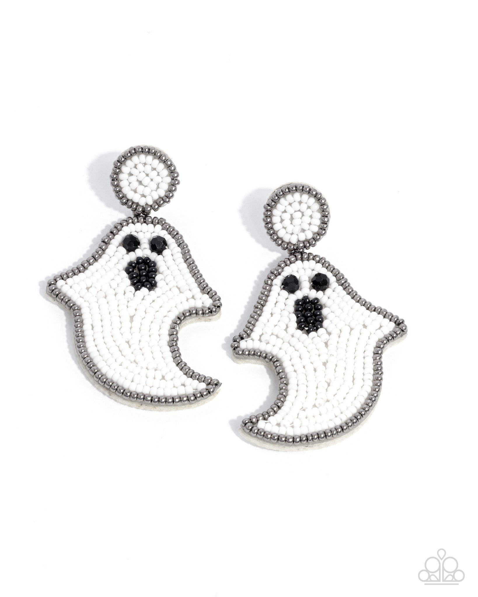 Infused with black rhinestone and seed bead details, dainty white and silver seed beads stack into a ghost at the bottom of a matching round seed-beaded fitting for a spooky spotlight. Earring attaches to a standard post fitting.