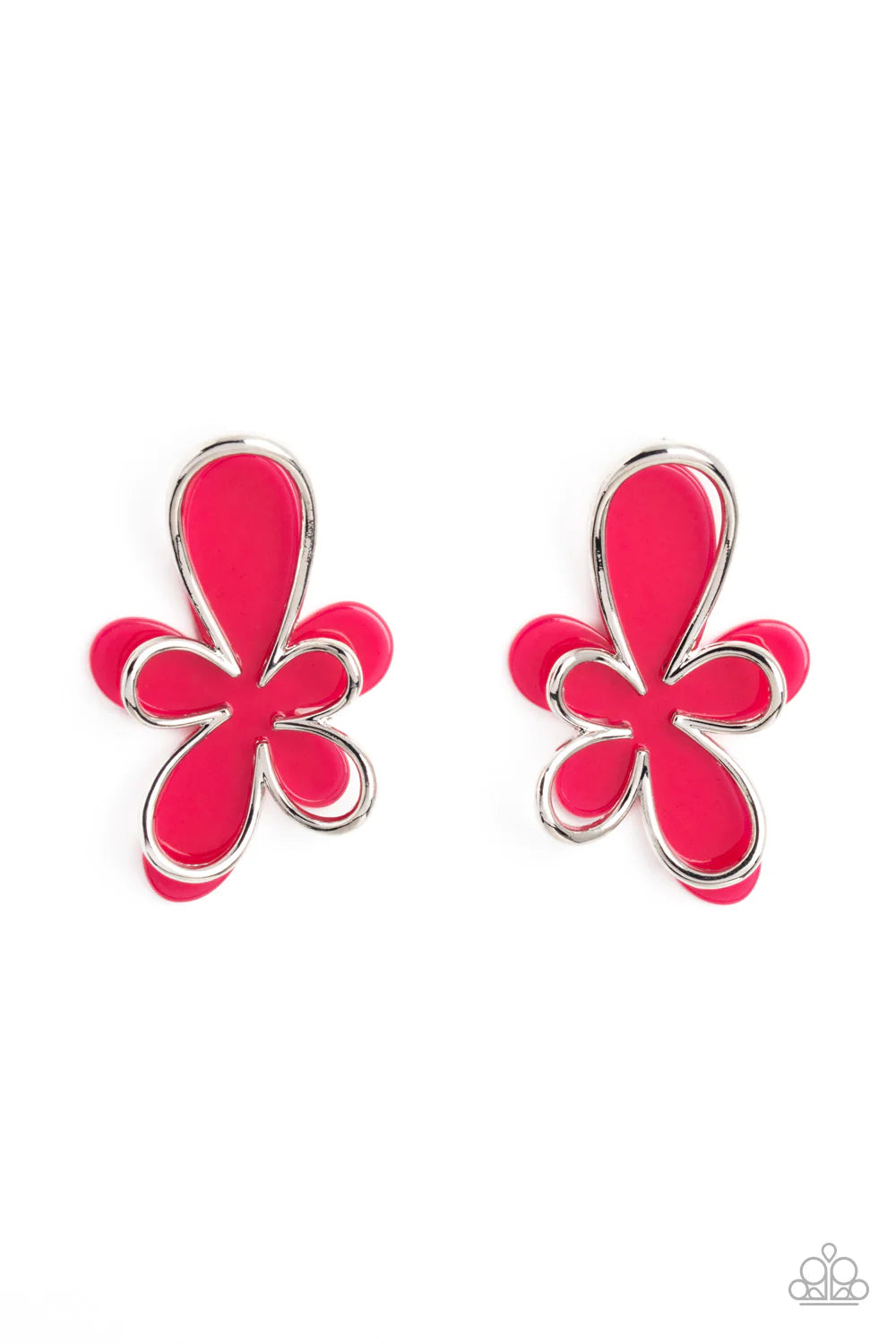 Overlapping a hot pink abstract acrylic flower, a silver outline in the same abstract floral shape glimmers atop the pop of color for a three-dimensional fashionable lure. Earring attaches to a standard post fitting.