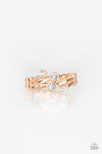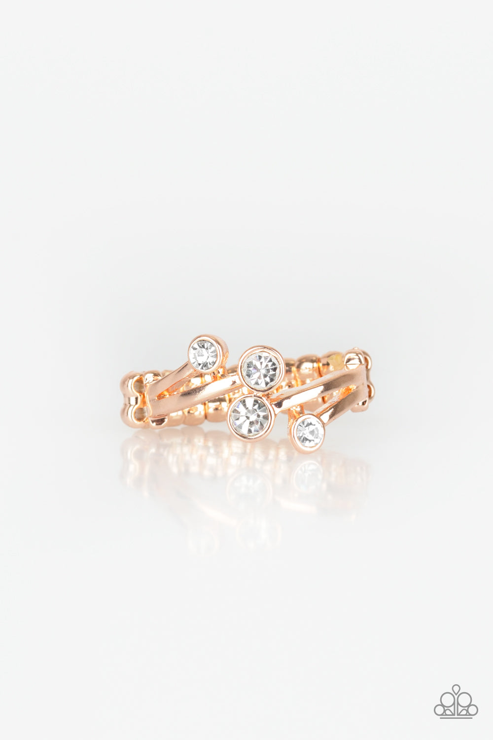 Dotted with glittery white rhinestone ends, rose gold bars fan across the finger. The dainty rhinestones collect at the center for a refined flair. Features a dainty stretchy band for a flexible fit.