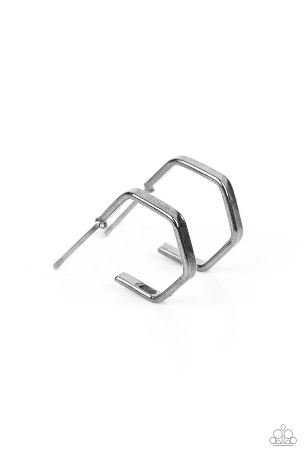 A deceptively simple hexagon frame is tilted on a point to create a geometric hoop around the ear. Its curved angles are complemented by its rich gunmetal finish, making a lasting impression. Earring attaches to a standard post fitting. Hoop measures approximately 1/2" in diameter.