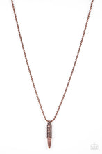 A tribal-inspired motif wraps around a copper bullet-shaped pendant at the end of a round copper box chain resulting in a striking ancestral adornment below the collar. Features an adjustable clasp closure.