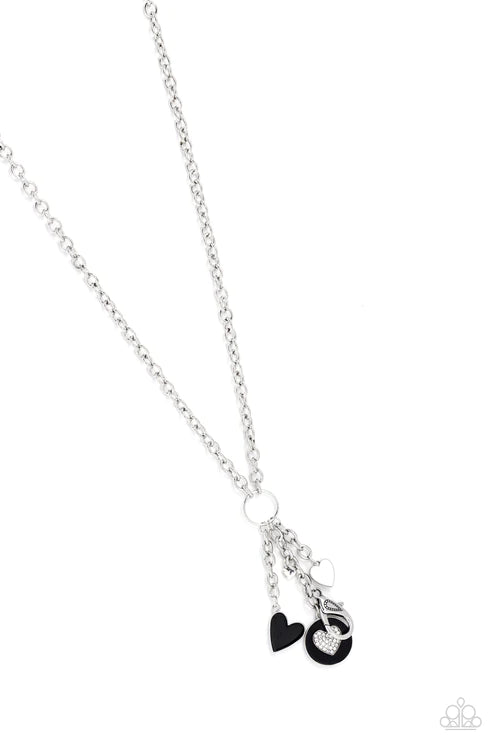 A black-painted disc charm with a white rhinestone-heart center and black, white, and silver heart charms swing from the bottom of a lengthened silver link chain for a romantically clustered look. A lobster clasp hangs from the bottom of the design to allow a name badge or other item to be attached. Features an adjustable clasp closure.