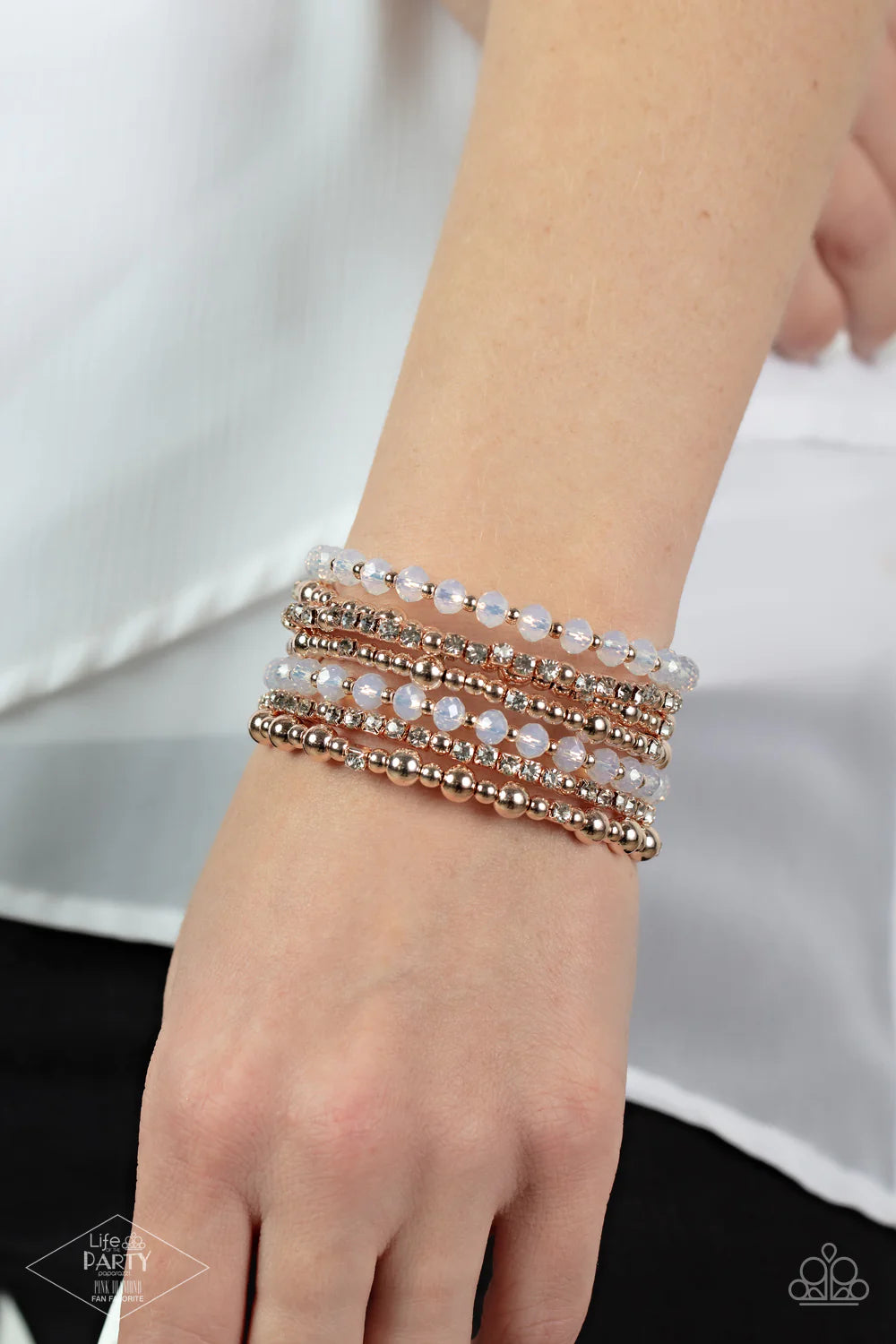An icy collection of rose gold beads, rose gold cubes, opaque crystals, and glassy white rhinestones are threaded along a coiled wire, creating a blinding infinity wrap style bracelet around the wrist.