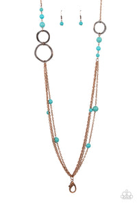 Three copper rings in textured and matte finishes accent the top of a lengthened copper chain. Round turquoise stone beads float haphazardly along below on a trio of copper chains for a colorfully charming display. A lobster clasp hangs from the bottom of the design to allow a name badge or other item to be attached. Features an adjustable clasp closure.