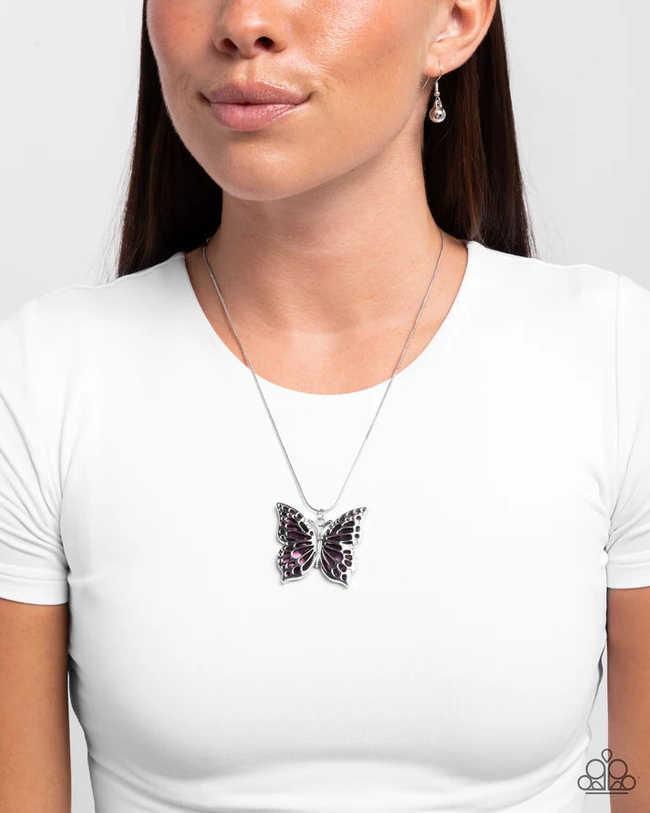 Pressed in an airy silver butterfly frame, bubbly purple acrylics flutter below the neckline from a silver snake chain for a whimsically wondrous display. Features an adjustable clasp closure.
