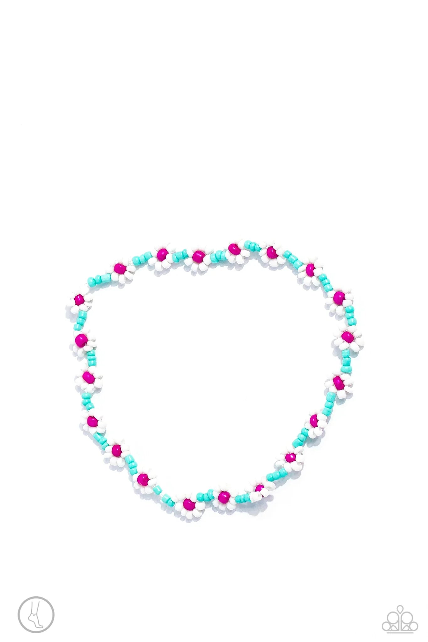 Strung along the entirety of an invisible wire, blue seed beads coalesce around the ankle. The row of blue seed beads are haphazardly interrupted by blooming white seed bead flowers, with pink centers for a carefree, charismatic finish.