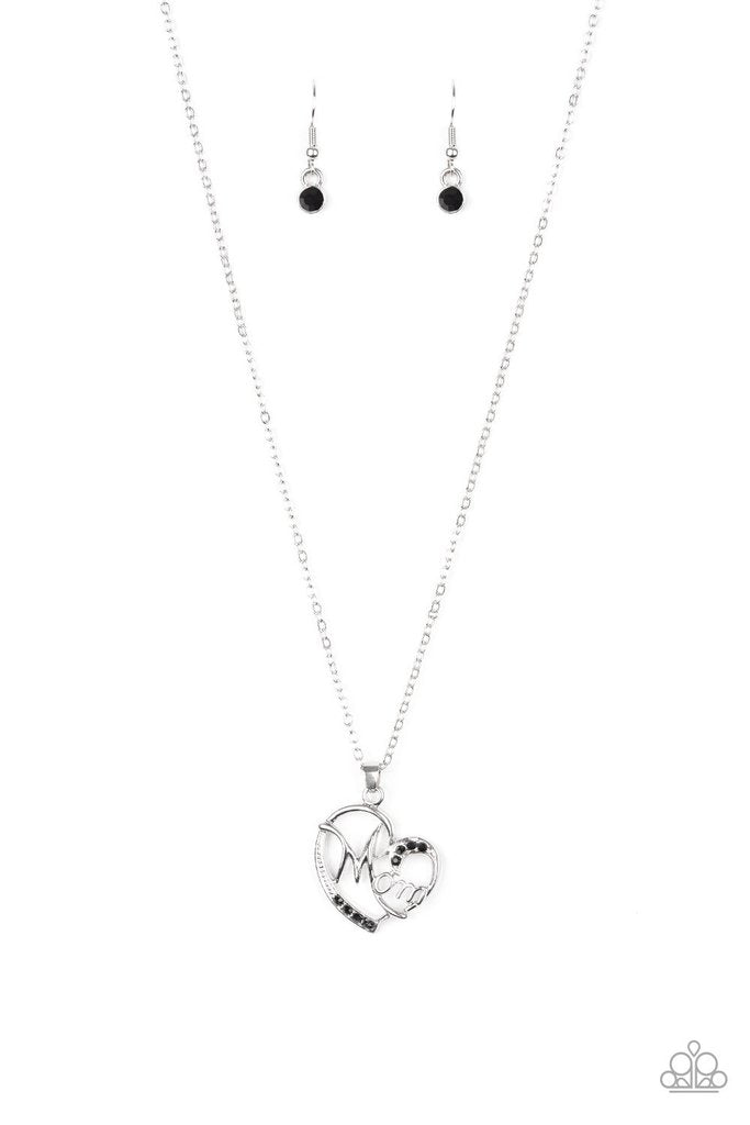 Encrusted in sections of dainty black rhinestones, a shimmery silver heart frame swirls into the word, "Mom", across the center. The charming pendant swings from the bottom of a dainty silver chain below the collar for a timeless finish. Features an adjustable clasp closure.