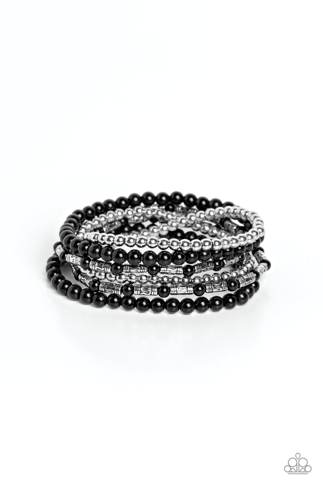A trendy collection of black, silver and silver cylindrical textured beads wrap around the wrist on elastic stretchy bands for a colorful, seasonal stack.