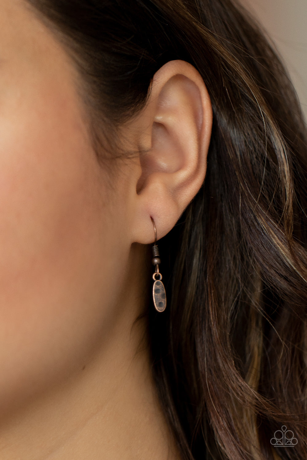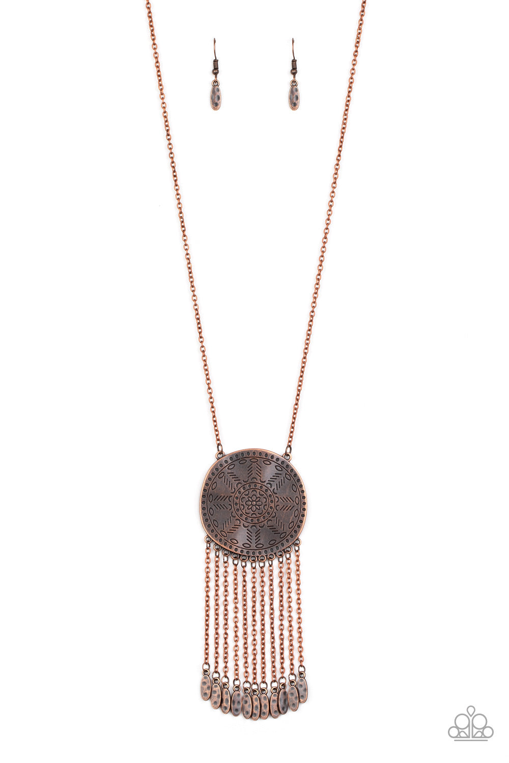 Stamped in a decorative floral pattern, an imperfect copper disc swings from the bottom of a lengthened copper chain. Copper chains and hammered copper beads stream from the bottom of the rustic pendant, creating a flirty fringe. Features an adjustable clasp closure.