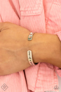 A minimalistic silver bar etched with the words, “one of a kind” on one end and embellished with a dainty rhinestone and pastel gems on the other, curves into a simple cuff around the wrist.