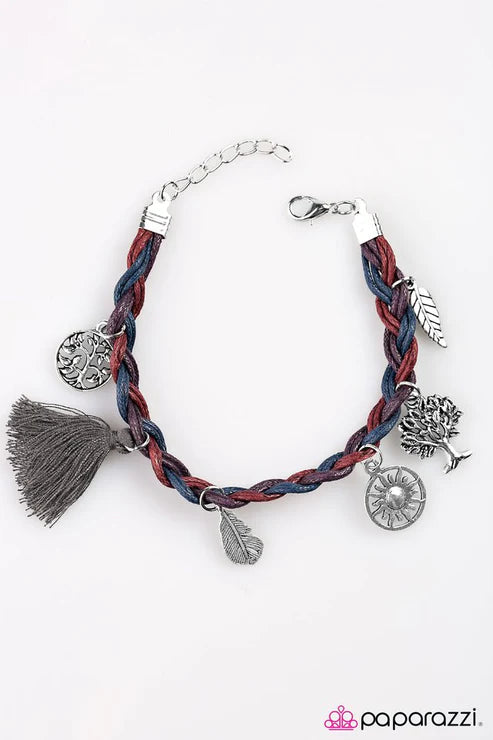 Shiny blue, red, and purple cording weaves into a colorful braid across the wrist. Radiant silver charms and a soft threaded tassel swing from the wrist in a free-spirited, wanderlust fashion. Features an adjustable clasp closure. Sold as one individual bracelet.