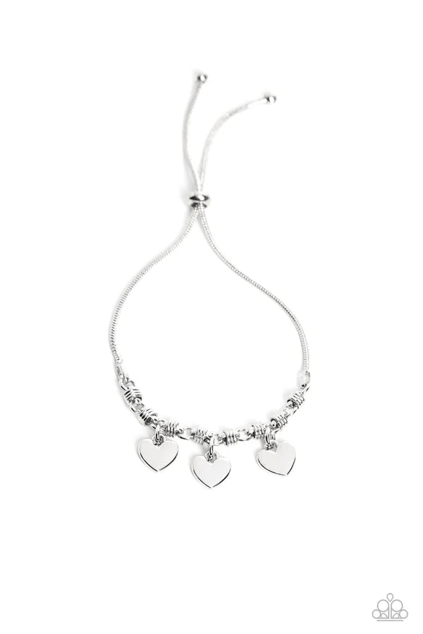 Dangling from a silver snake chain, a trio of silver hearts link across the wrist for a dash of swoon-worthy sheen. Infused along the heart chain, silver spiral-like accents add additional texture to the monochromatic design. Features an adjustable sliding knot closure