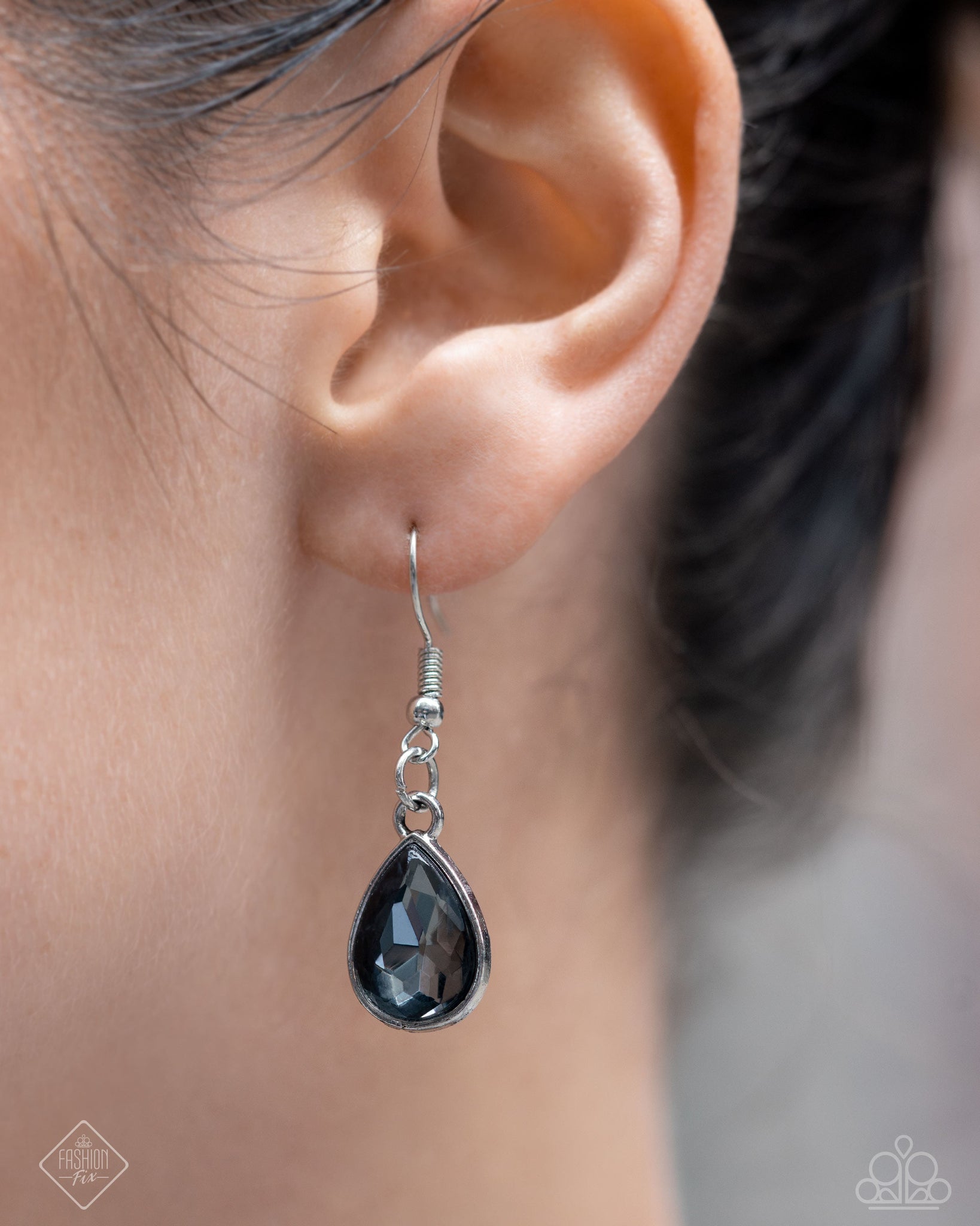 Connecting to a black ribbon, a thick silver curb chain coalesces below the neckline. Pressed in teardrop, square, and round frames, a collection of smoky, silver, and copper aurum gems cascades in three frames for a sassy display of shimmer. Features a ribbon closure.