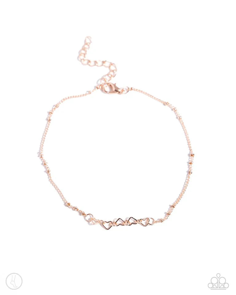 Featured in the center of a rose gold satellite chain, rose gold heart silhouettes alternate in direction along the ankle for a subtly sweet statement. Features an adjustable clasp closure.