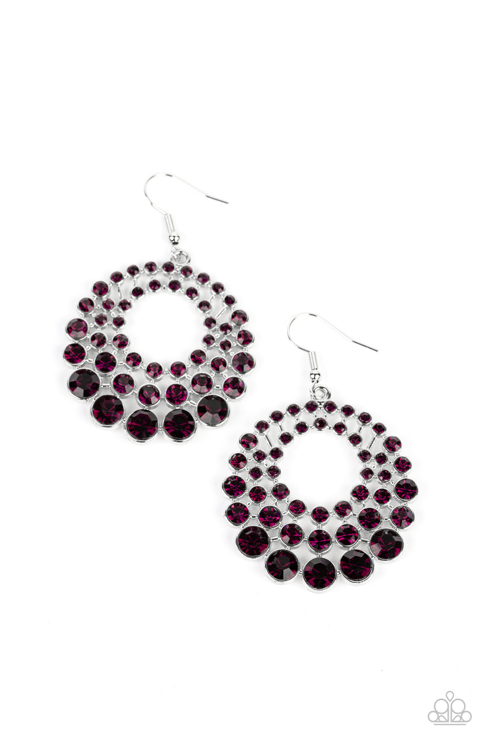 Gradually increasing in size and intensity, row after row of glassy purple rhinestones stack into a layered hoop for a blinding effervescence. Earring attaches to a standard fishhook fitting.