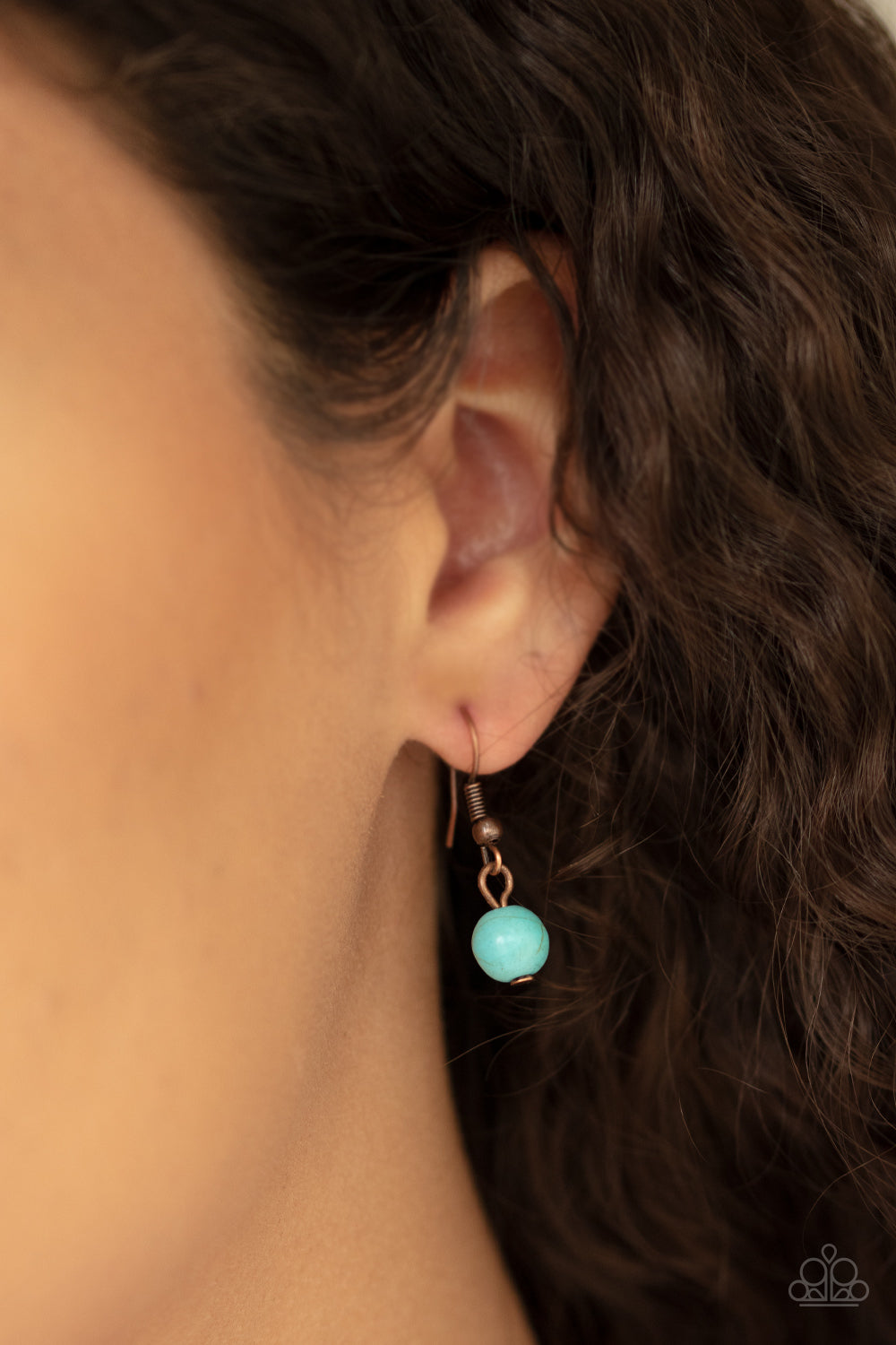 Dotted with dainty turquoise stones, an ornately studded copper frame swings from the bottom of a decorative copper fitting. Infused with a lengthened copper chain, the rustic frame is brushed in an antiqued finish for a seasonal look. Features an adjustable clasp closure.