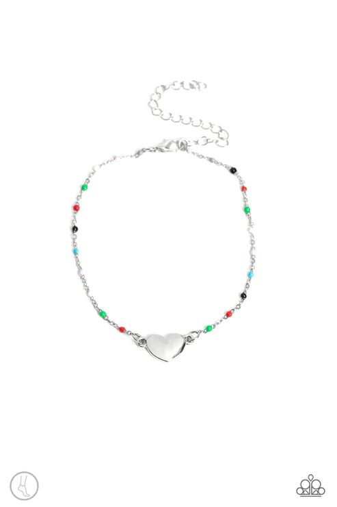 A dainty strand of multicolored beaded silver chain wraps around the ankle for a dainty pop of color. An imperfect silver heart rests in the center of the beaded strand for a romantic finish. Features an adjustable clasp closure.