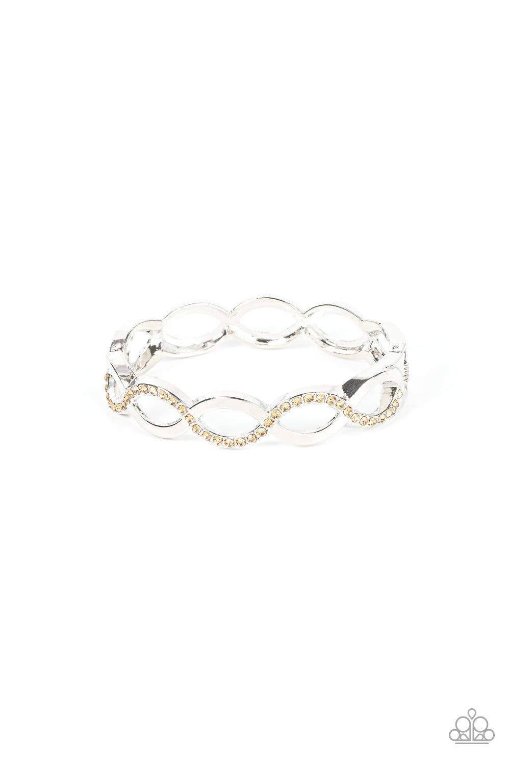 Silver bars elegantly intertwine into infinity inspired frames that delicately hinge around the wrist. The front of the flawless centerpiece is dusted in a wavy row of golden topaz rhinestones, adding a timeless twinkle to the versatile design. Features a hinged closure.