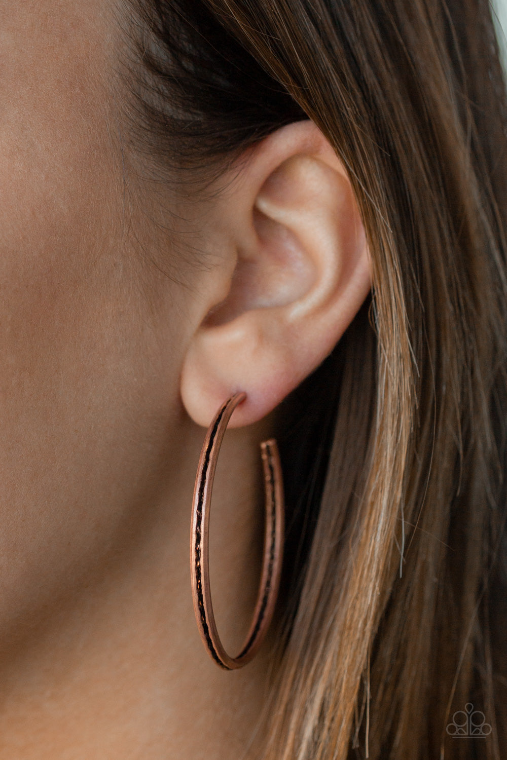 The inside and outside of a folded copper hoop is stamped in tribal inspired textures for a trendy look. Earring attaches to a standard post fitting. Hoop measure approximately 2" in diameter.