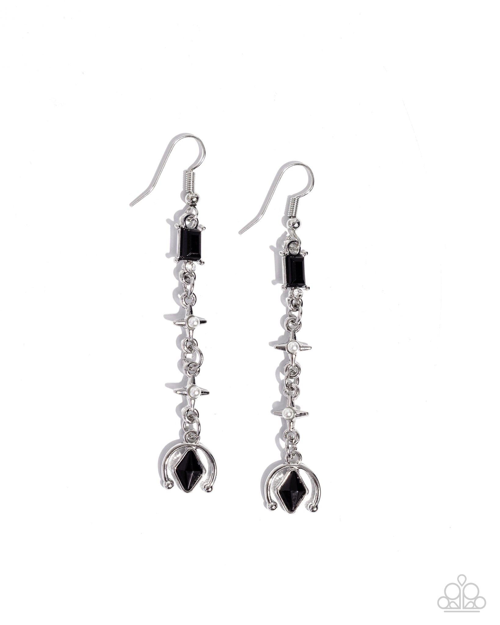 Pressed into various silver fittings, a collection of black emerald-cut gems, solitaire white gems, white pearls, and a black diamond-shaped gem that dangles inside an upside-down horseshoe cascade down the ear for a trendy, shoulder-dusting lure. Earring attaches to a standard fishhook fitting.