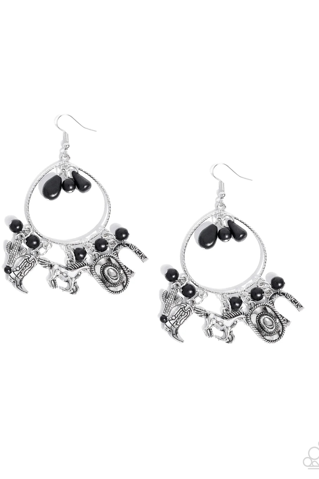 Featuring round and teardrop shapes, black stones dangle from the top of an oversized, textured silver teardrop frame. Additional round black stones join a collection of silver cowboy chic charms including a textured cactus, a detailed cowboy boot, a wild stallion, a textured cowboy hat, and a horseshoe stamped with the phrase "Good Luck" that sways from the bottom of the frame for a glamorously Western fringe. Earring attaches to a standard fishhook fitting. As the stone elements in this piece are natural, some color variation is normal.