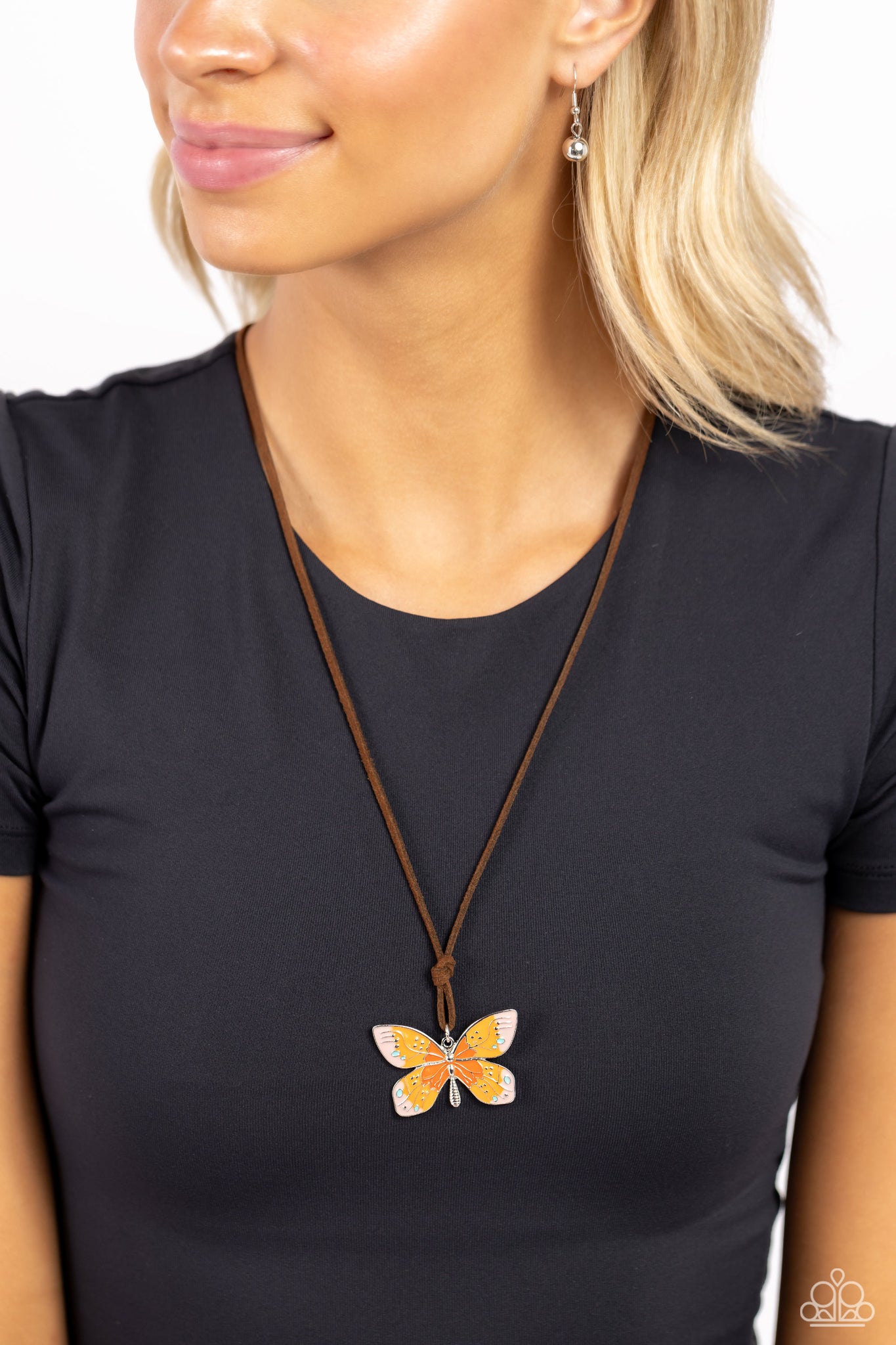 Featuring an ombre effect of baby pink to coral to Burnt Orange and accents of tiffany, a vivacious oversized butterfly flutters at the bottom of a knotted lengthened strand of brown suede for a wanderlust statement. Features an adjustable sliding bead closure.